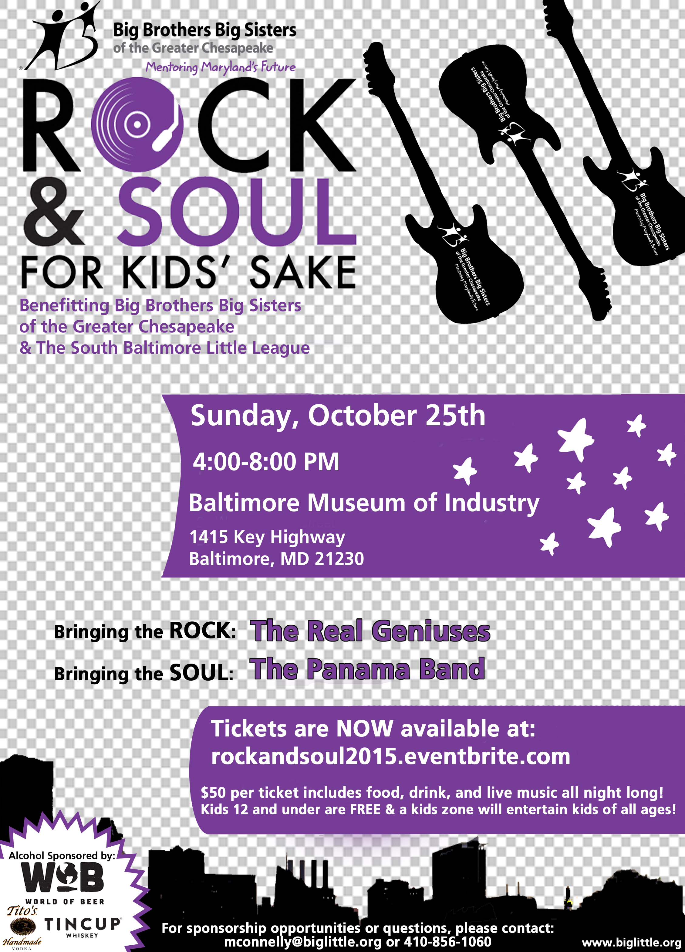 Now in its 5th year, Rock for Kids Sake is getting a little SOUL for 2015--and with the new name comes even more great music, a harbor-front location and a family friendly vibe. In addition to benefiting Big Brothers Big Sisters of the Greater Chesapeake,a percentage of this years proceeds will go to the South Baltimore Little League. The Little League is another local organization bettering the lives of young people in the vicinity of the event. There will be plenty of food and drink for guests to enjoy while rockin' on the waterfront. We will also have a Kids Zone featuring face painting, balloon art, caricature art and more! Children under 12 are FREE and do not need a ticket. Adult Ticket prices not only include admission and entertainment to keep you grooving on the water, but food and drink (including libations for those 21+) Providing the music and keeping us grooving all evening long will be The Real Geniuses and The Panama Band.