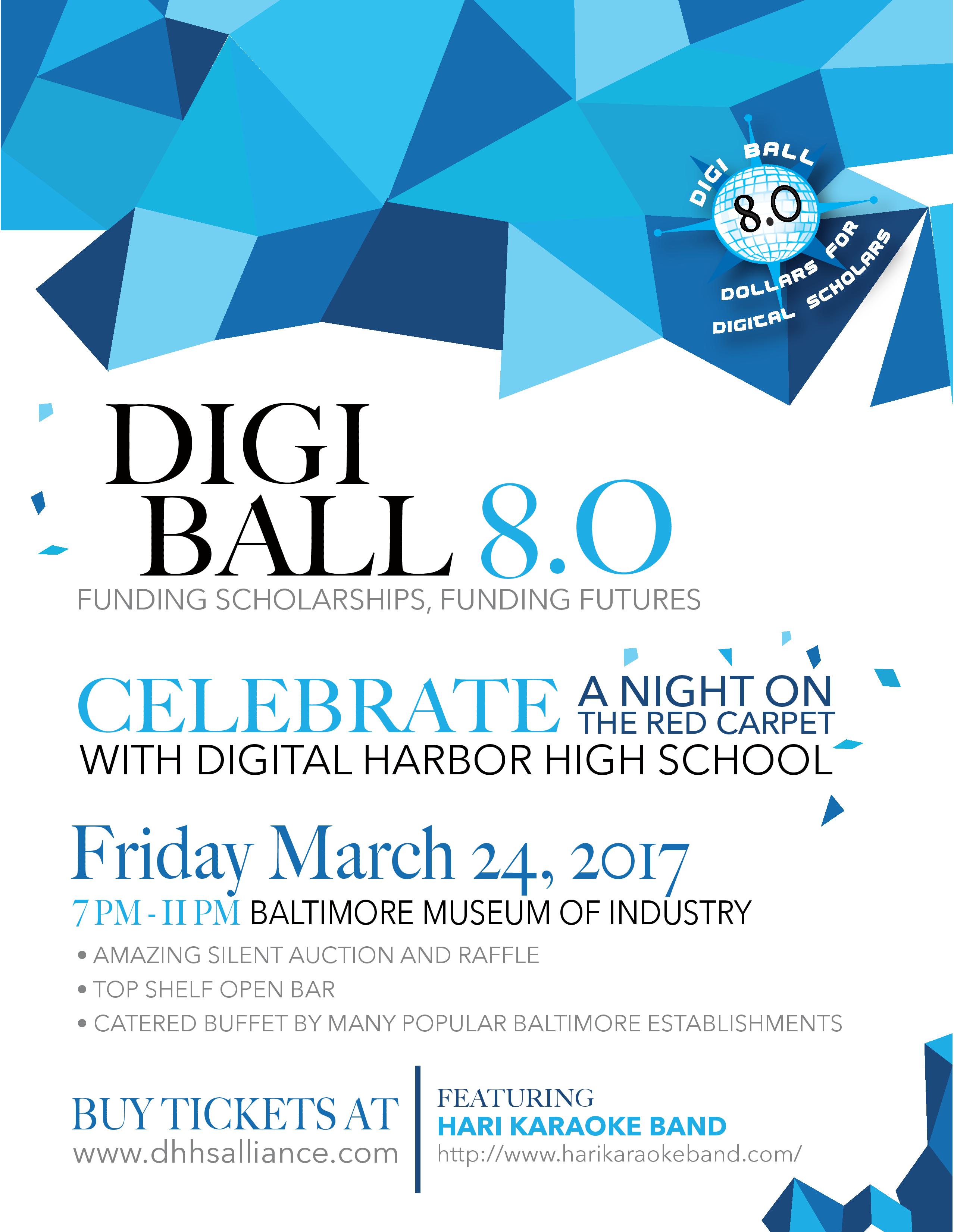 Come one, come all! Invite your friends to join us for "The Party With a Purpose." Help spread the word about how we are changing the lives of Baltimore City kids one scholarship at a time. DigiBall is a highly energized party that generates scholarship funds for Digital Harbor High School's graduating seniors. Guests will enjoy an Open Bar including signature drinks, a Food Buffet catered by more than 20 of Baltimore's finest restaurants, Live Music by DC's original HariKaraoke Band as well as a photo booth, 50/50 raffle, money wheel and a silent auction featuring such items as vacations, exclusive high-end products, gift certificates, event tickets and a whole lot more!